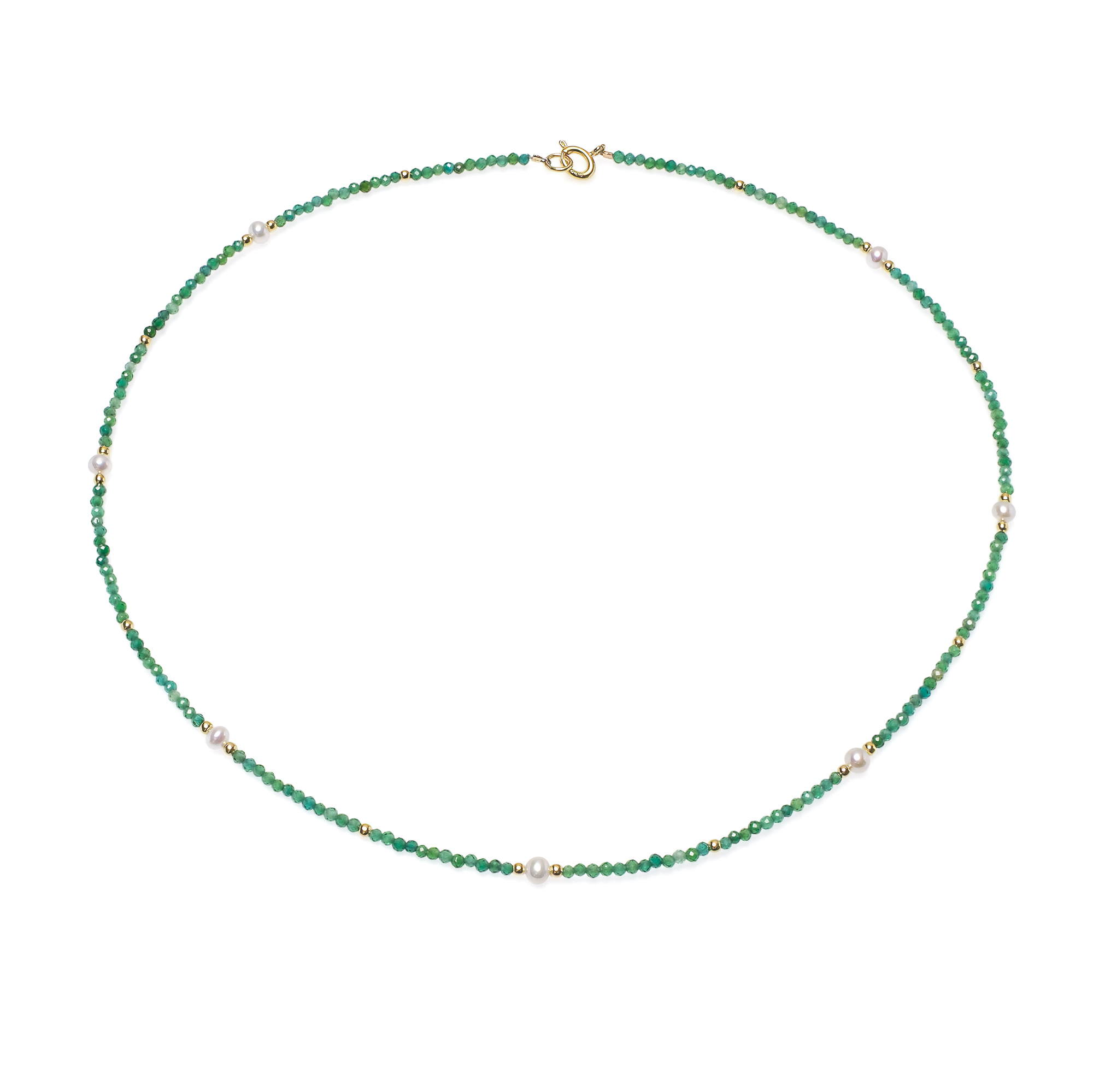 Потопете се в магията на цветовете с това великолепно колие, което съчетава наситената енергия на зеления шпинел с непреходната чистота на перлите. Комбинация, която носи усещане за пролет, хармония и лукс.