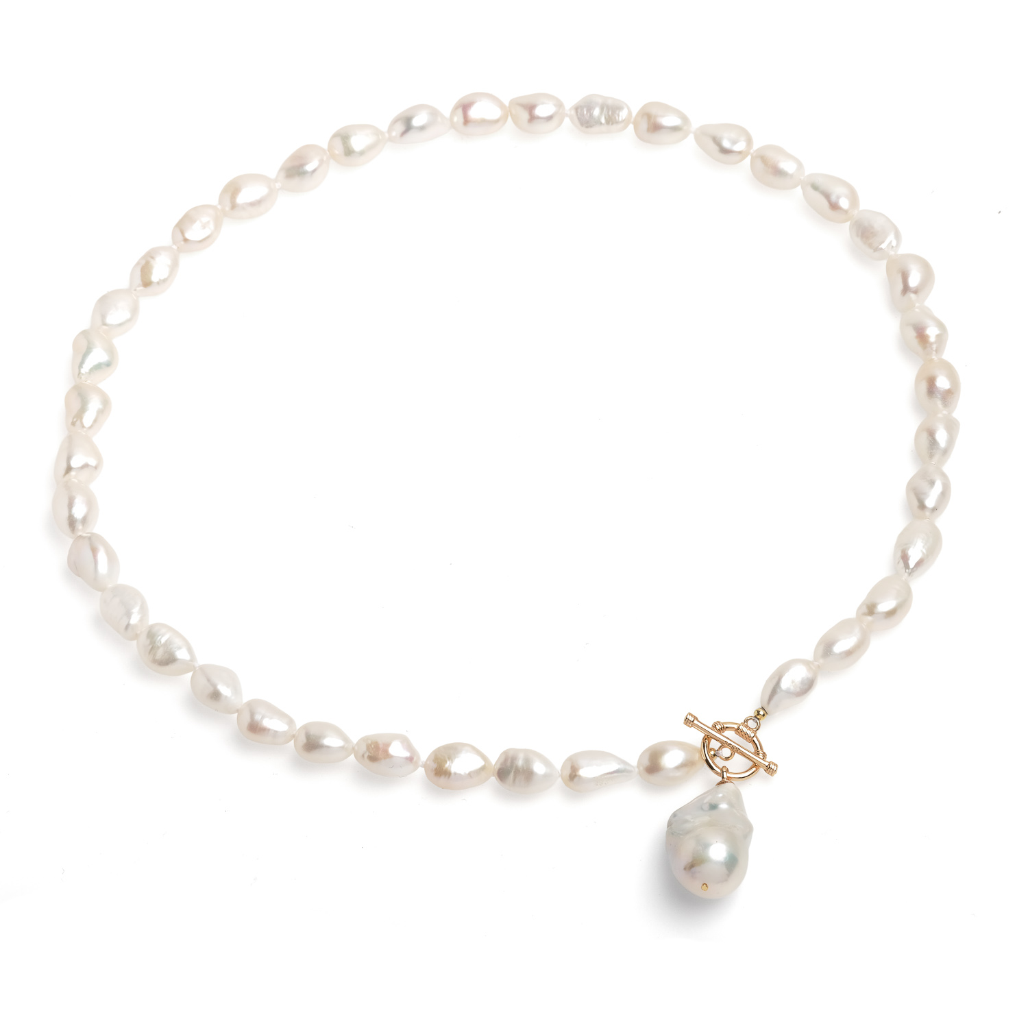 Колие с 9-11мм асиметричхи бели перли и1брой барокова перла. Сребърна закопчалка с позлата. Дължина 50см.