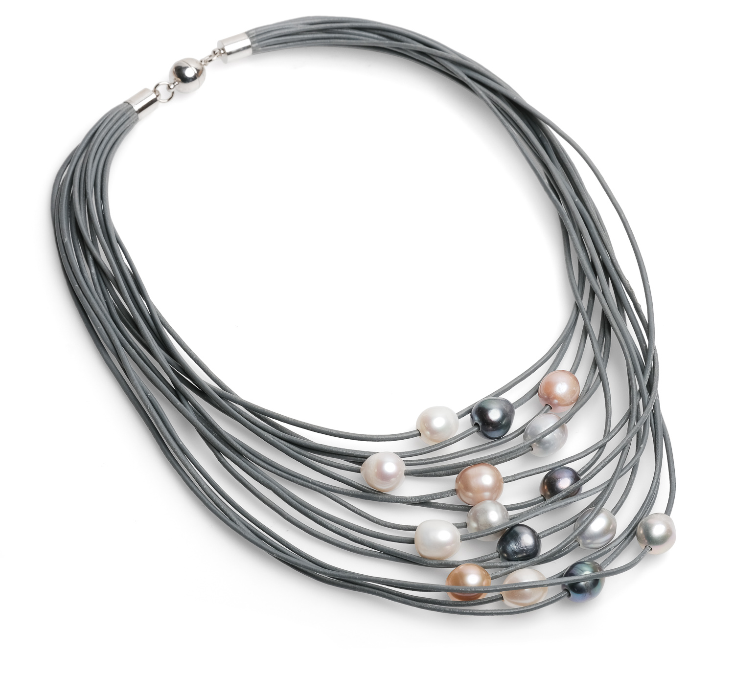 Колие 15 реда сива кожа, микс 15 цветни перли, 11-12мм,