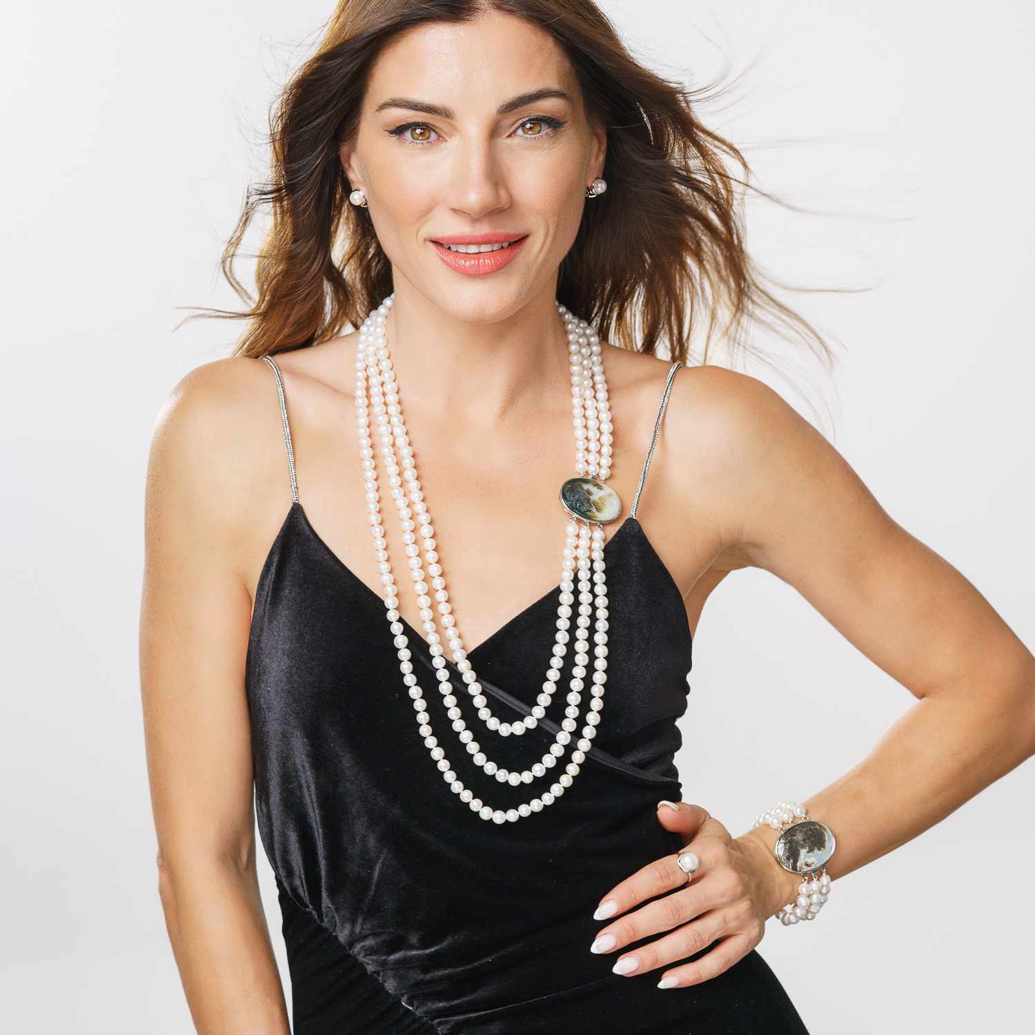 Елегантно гривна с 3 реда бели перли (8-9 мм),което съчетава класическа красота с модерни елементи. Закопчалката Камеа добавя завършеност и лукс към дизайна.