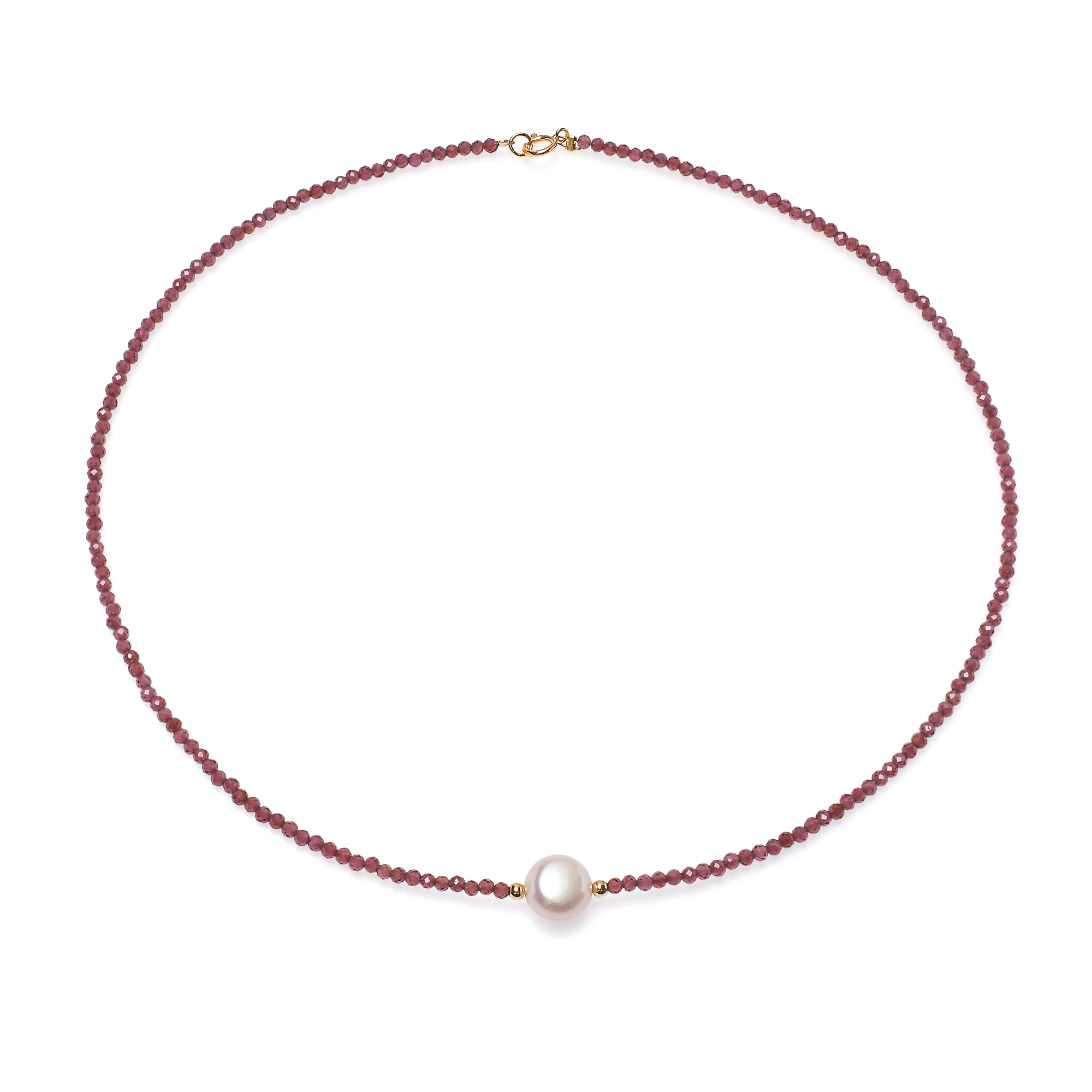 Гарнетът е известен като камък на жизнеността и енергията, а комбинацията му с перла превръща това колие в символ на хармония и стил. Позлатените елементи придават модерен контраст, който прави бижуто подходящо както за официални поводи, така и за изискана ежедневна визия.