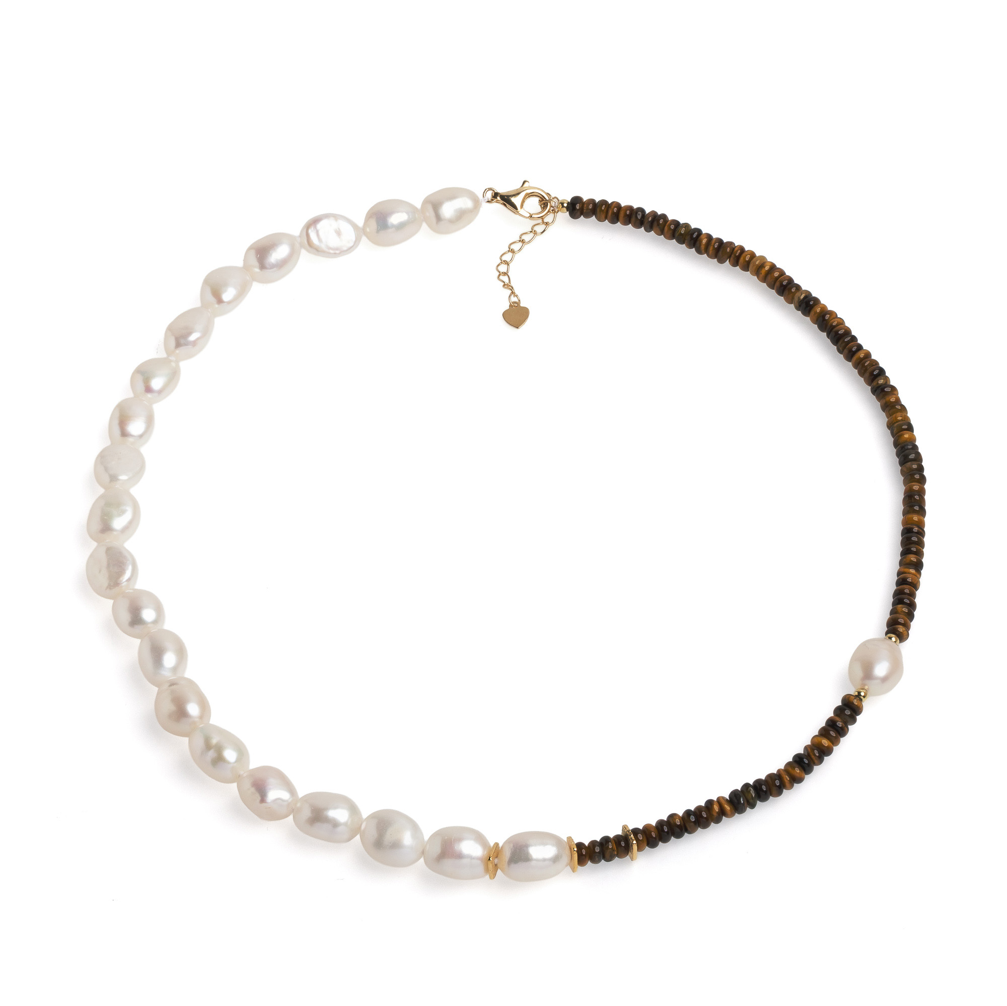 Колие 9,5-11мм бели перли и тигрово око, 45+4 см