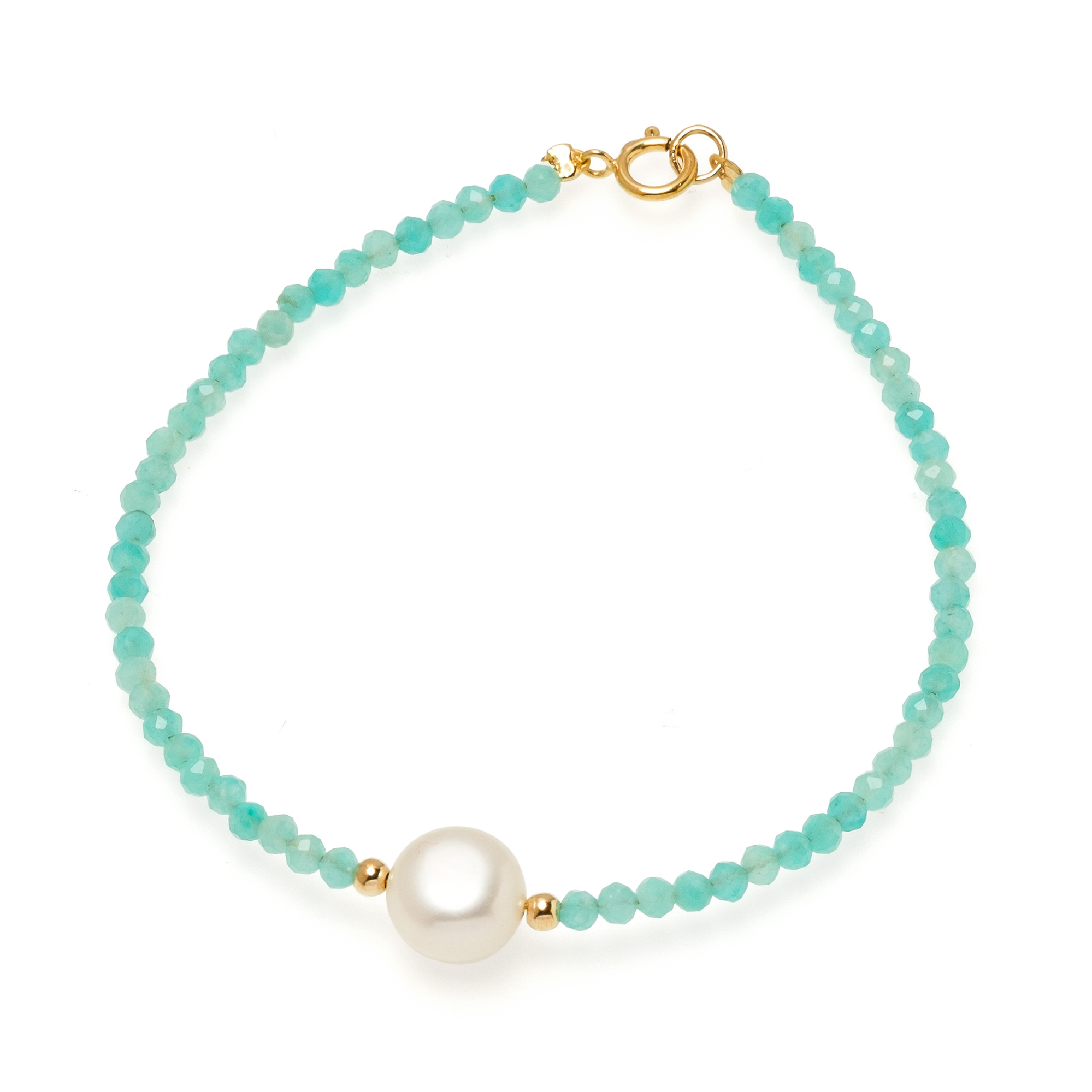 Тази гривна е истинско бижу за сетивата, съчетаващо успокояващата енергия на амазонита с вечната чистота на перлите. Нежният тюркоазен цвят на камъните напомня за чистите морски води, а централният акцент придава на бижуто завършен и луксозен вид.