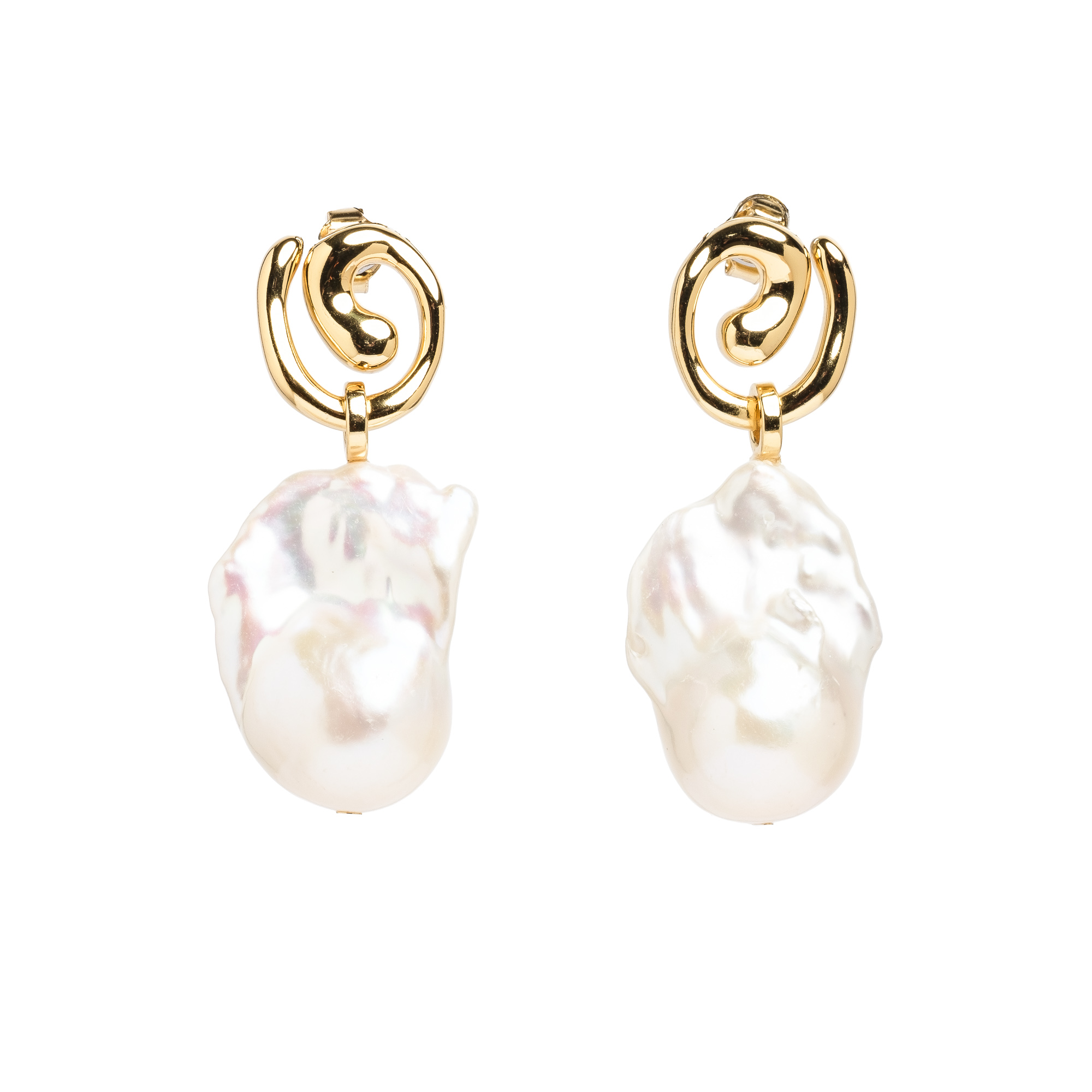 Позлатени сребърни обеци „Вихър от сияние“ с големи барокови перли
