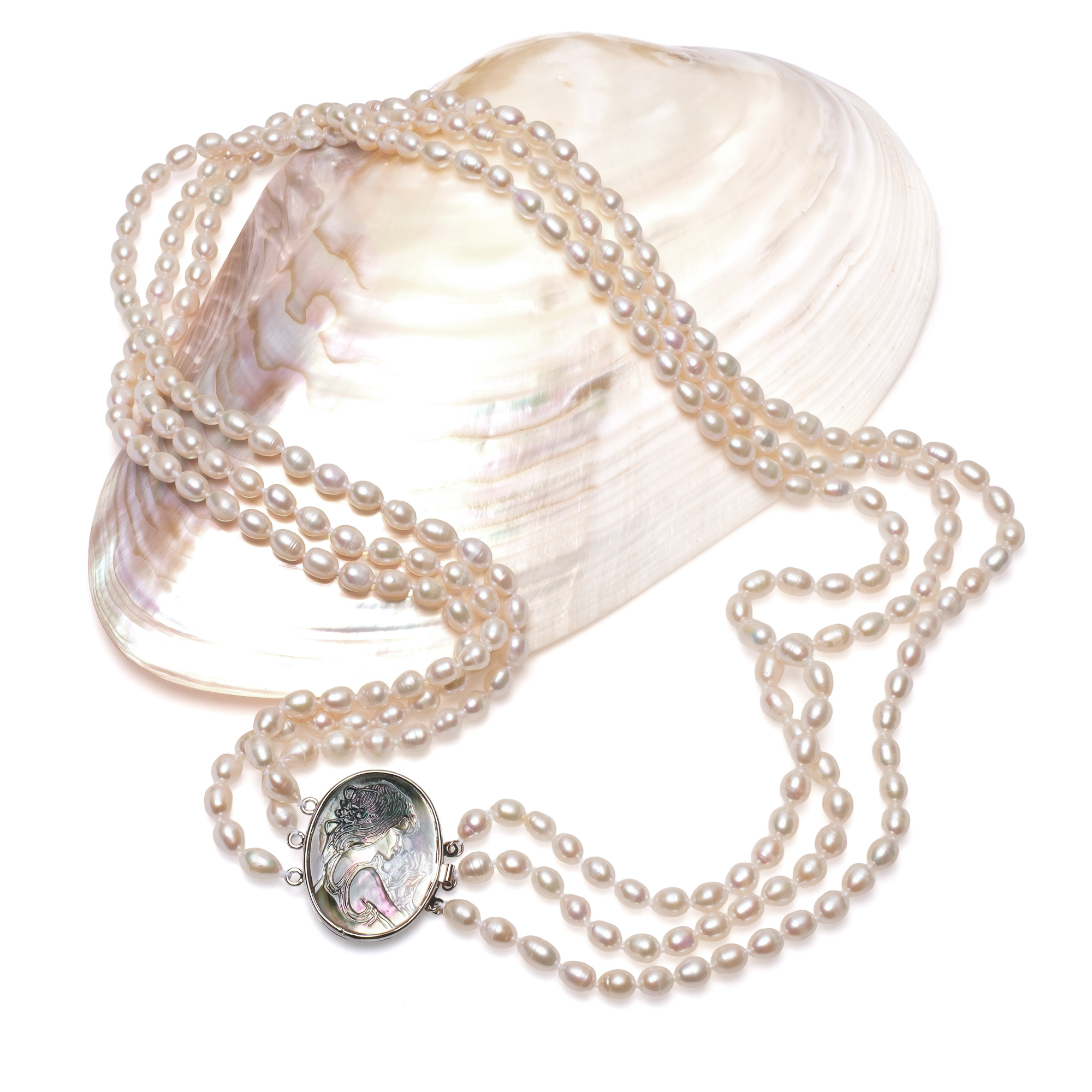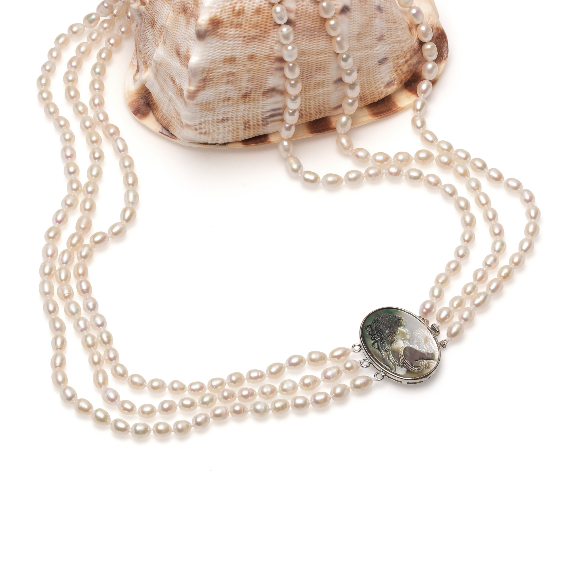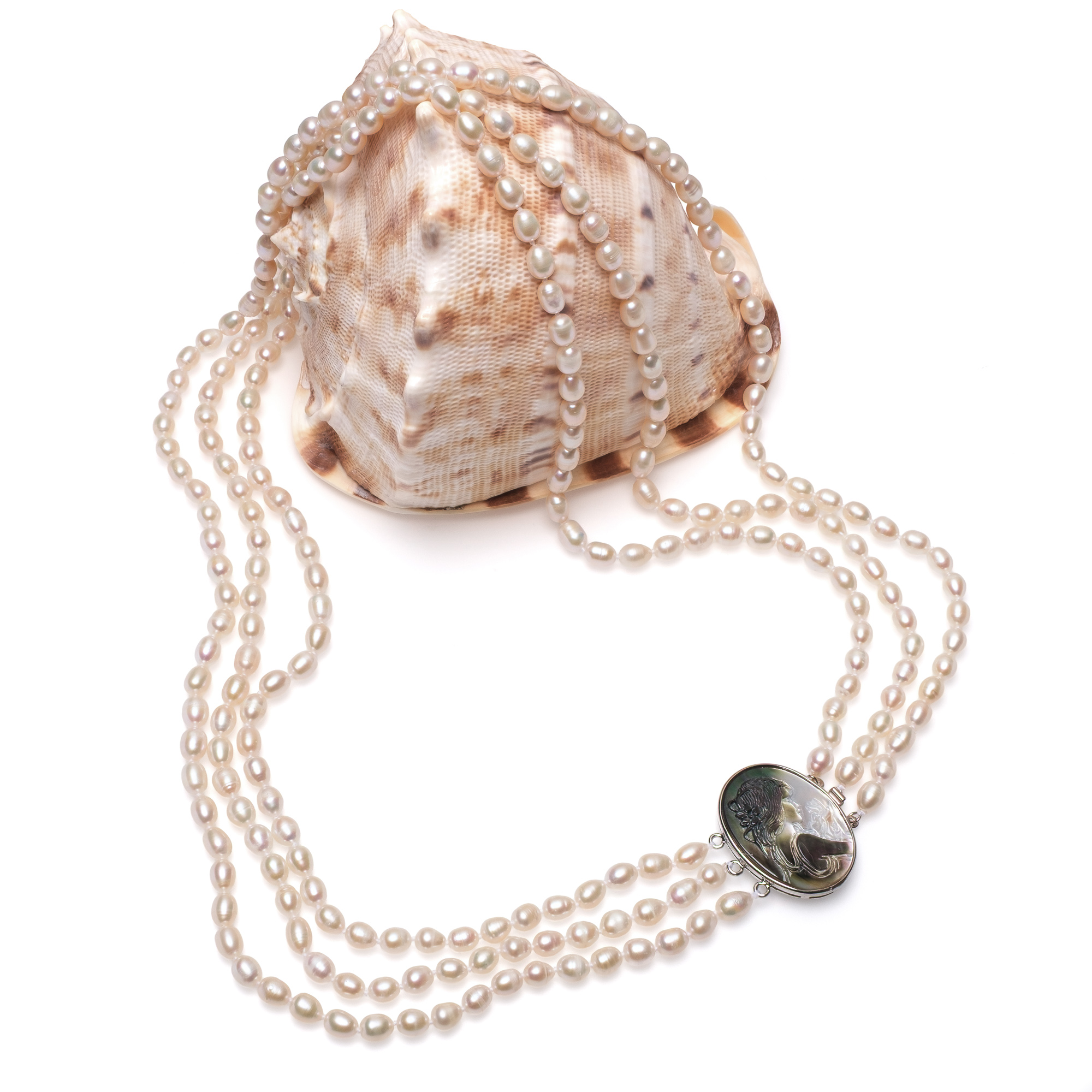 Колие с 3реда 6-7мм бели перли. закопчалка тип “Камеа“