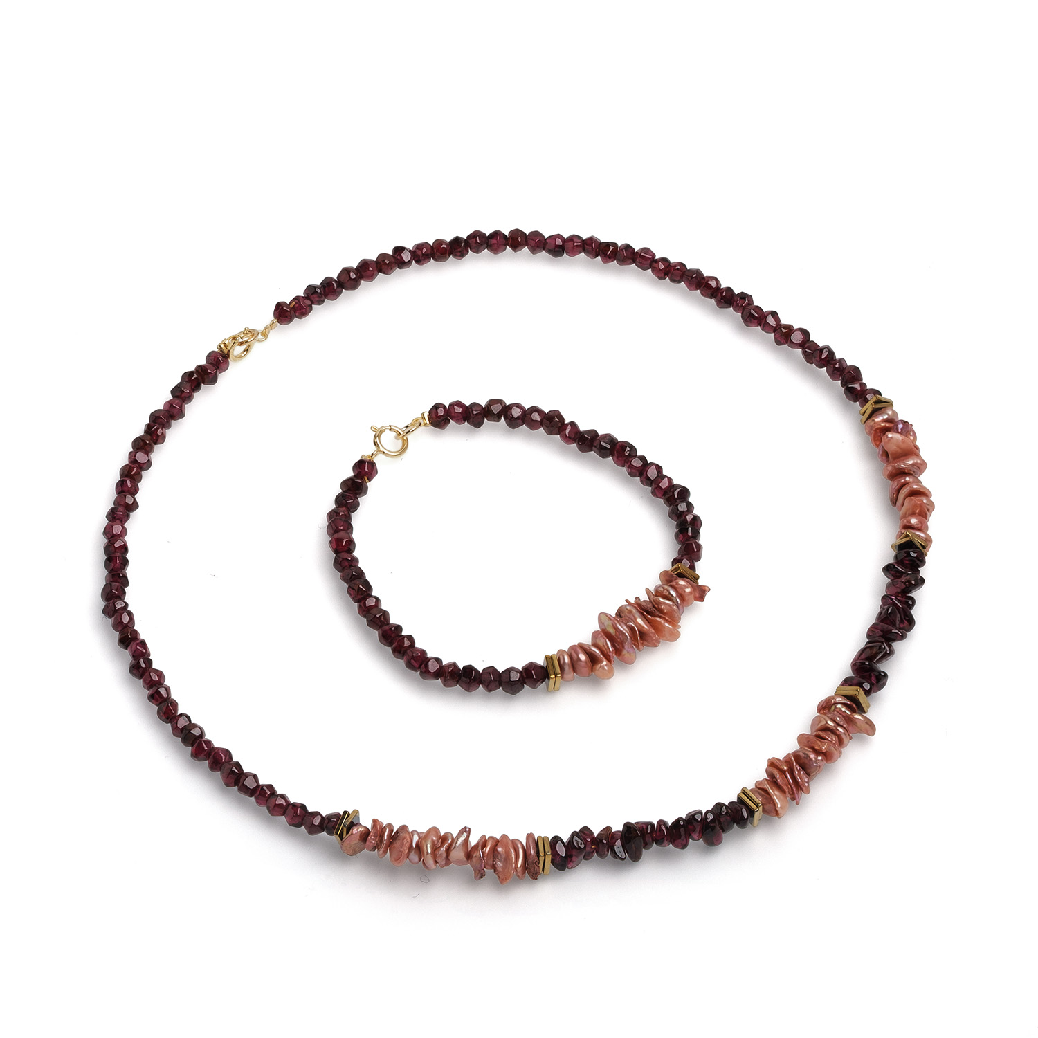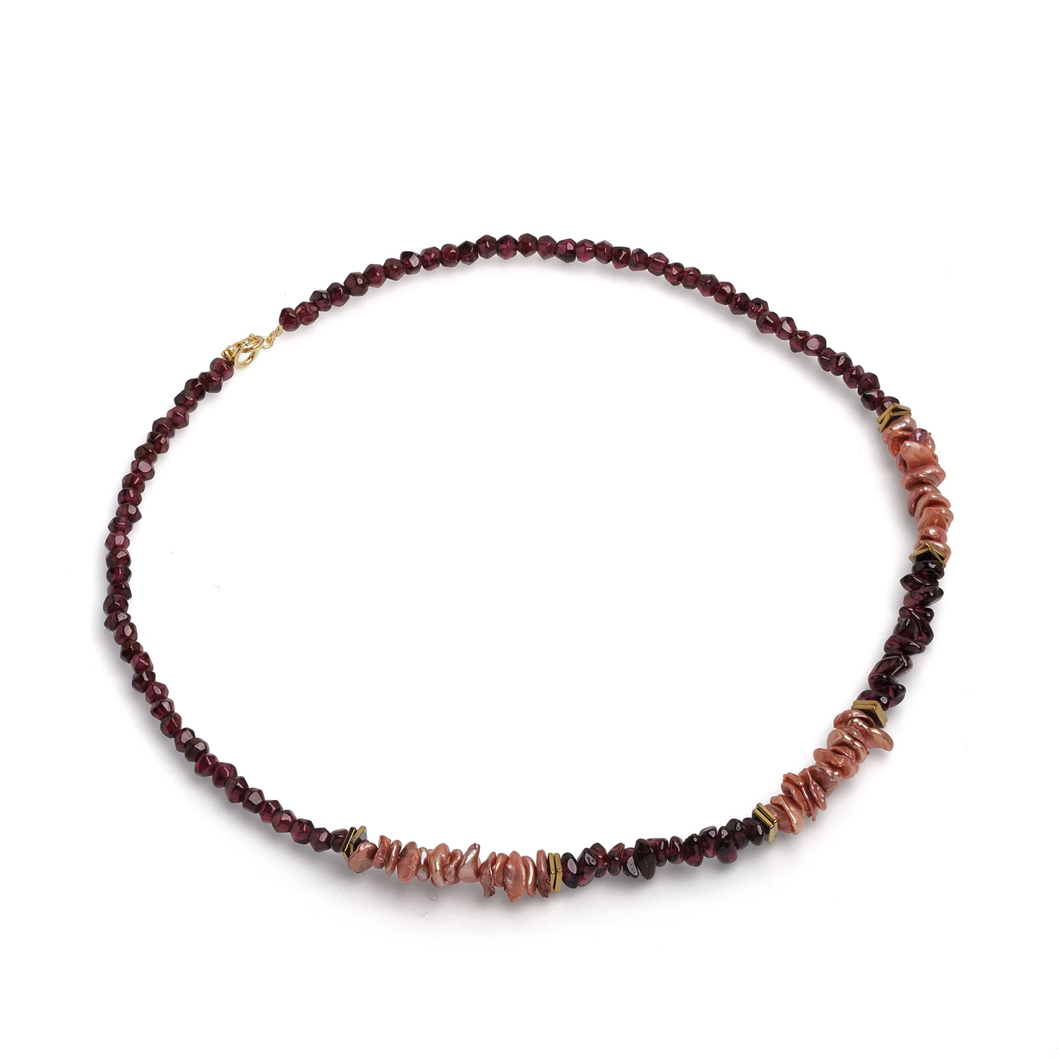 Елегантно колие, изработено с кеши перли и 4-5 мм мъниста от гранат, с позлатени елементи и закопчалка. С дължина 41 см, това бижу придава уникален и изтънчен акцент на всяка визия.
