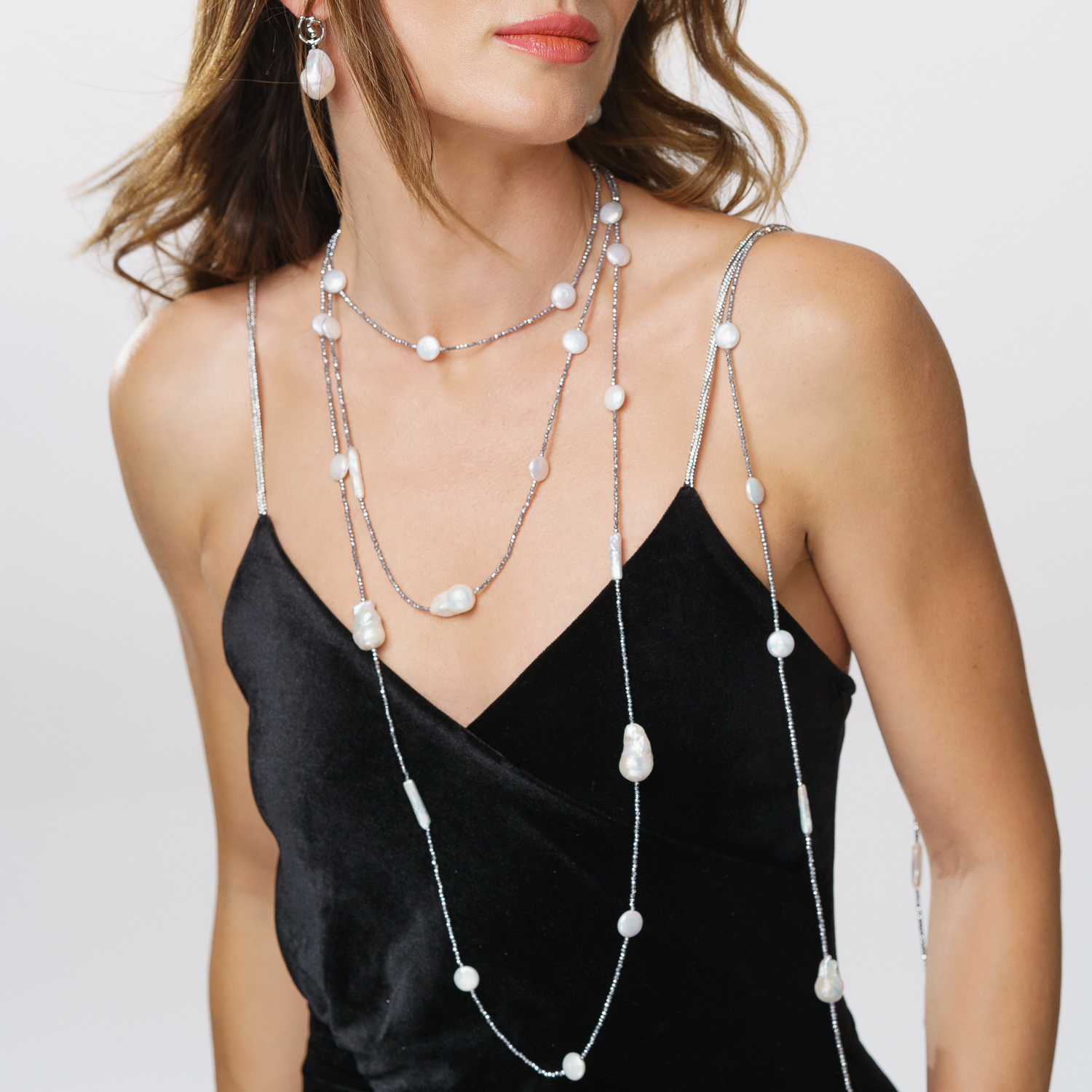 Арт колие с бели перли в разнообразни форми – барокови, пръчковидни и тип „паричка“, съчетани със сребрист хематит за модерен акцент и текстура. Завършено със сребърна закопчалка, с впечатляваща дължина от 97 см. Стилно и нестандартно бижу с артистично излъчване.