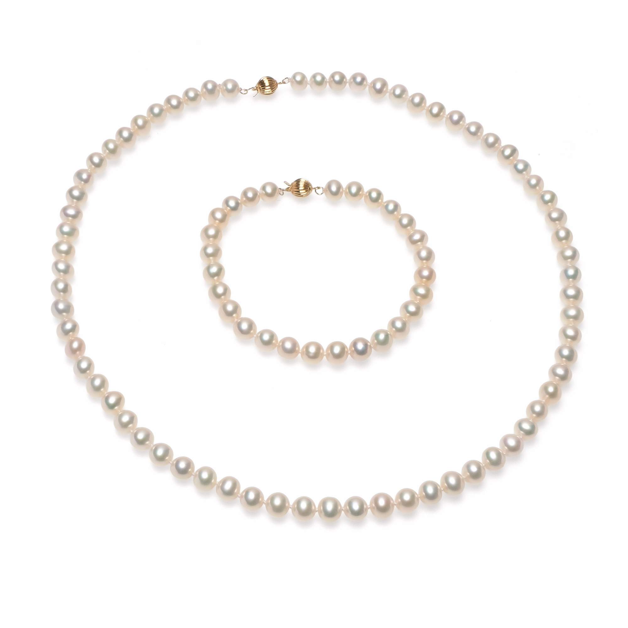 Комплект от колие и гривна с 6-7мм бели перли,14K златна закопчалка под формата на раирана сфера.