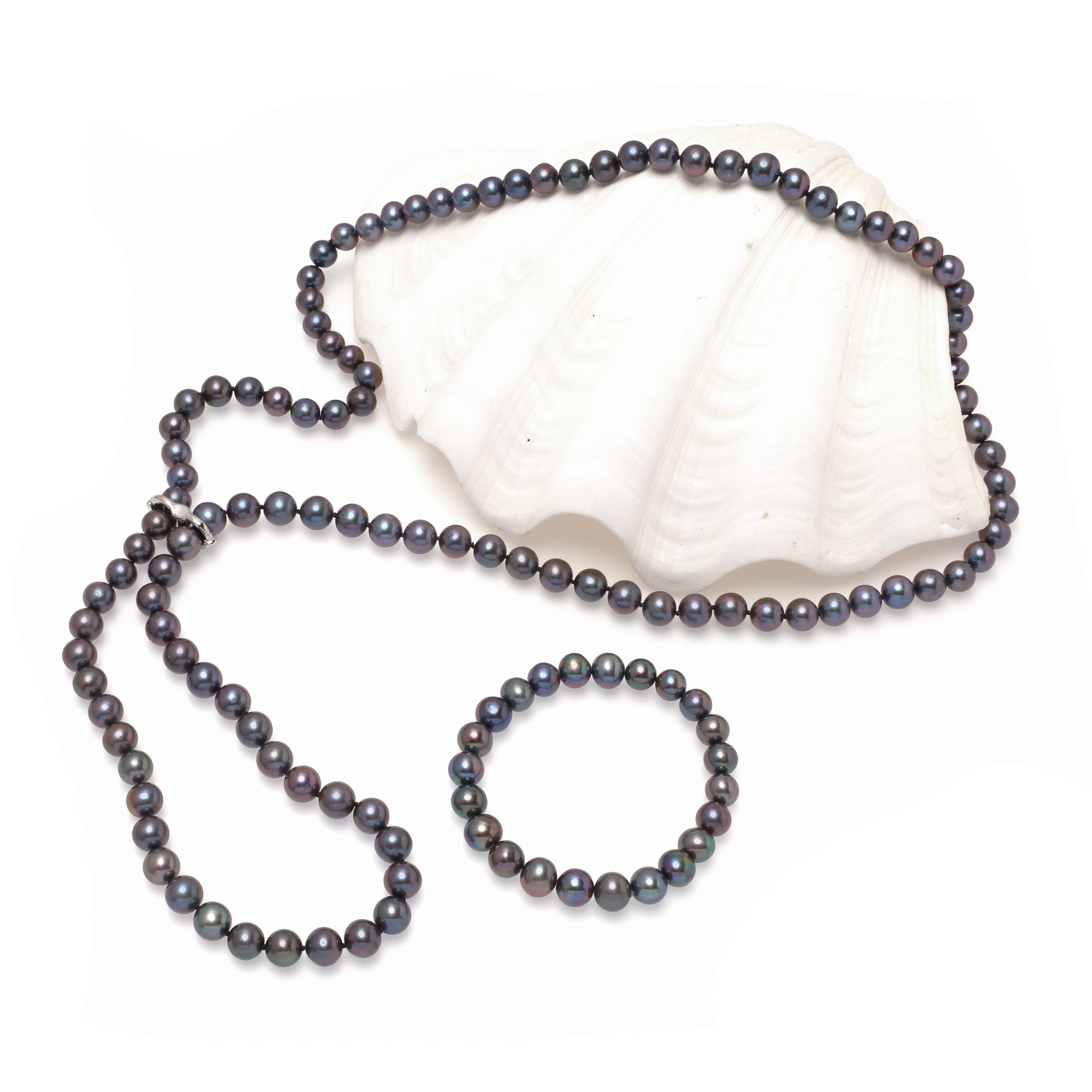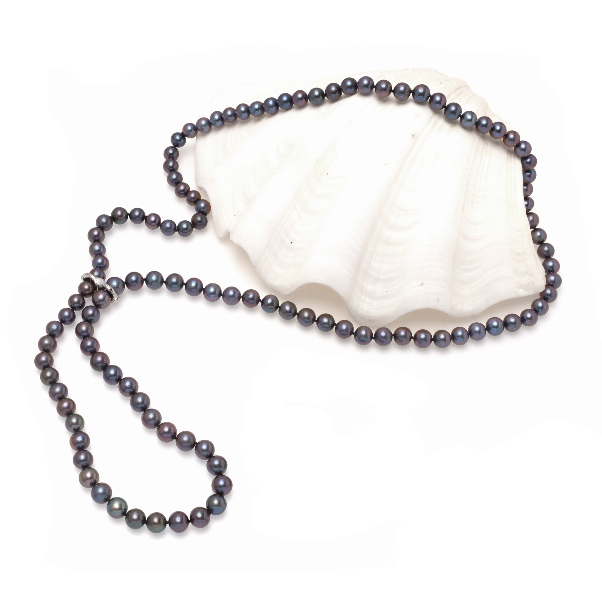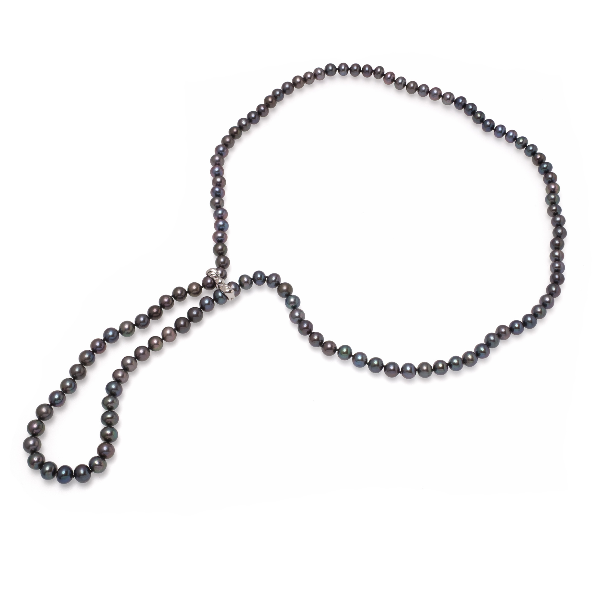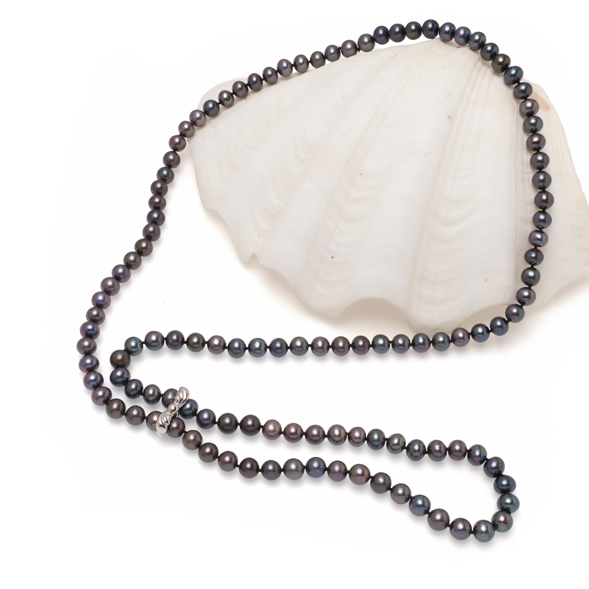Колие с тъмни перли 8-9 мм и сребърна закопчалка.