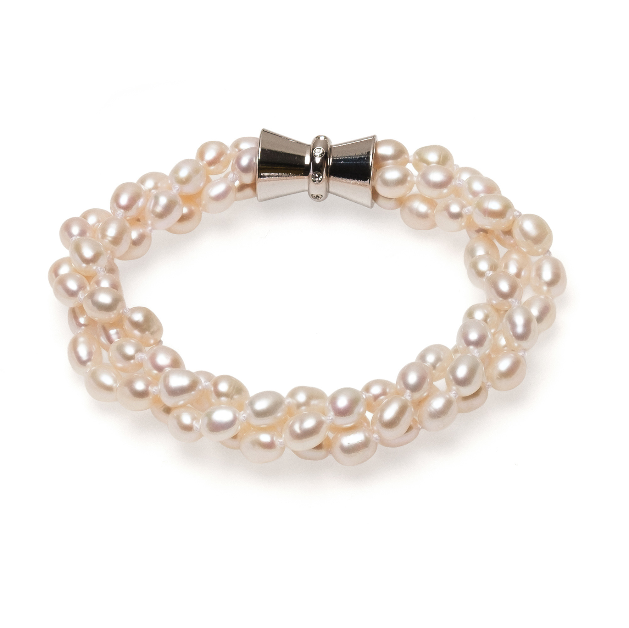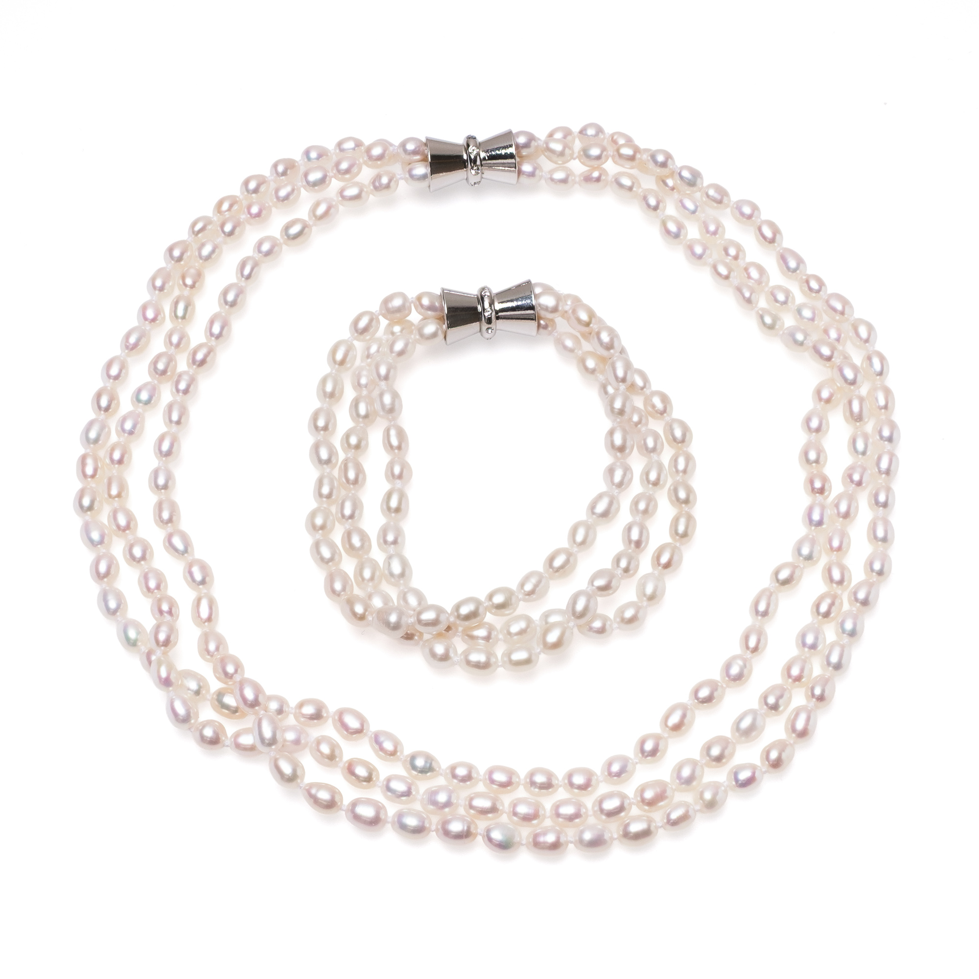 Ефектна гривна с три реда овални бели перли от 5-6мм.