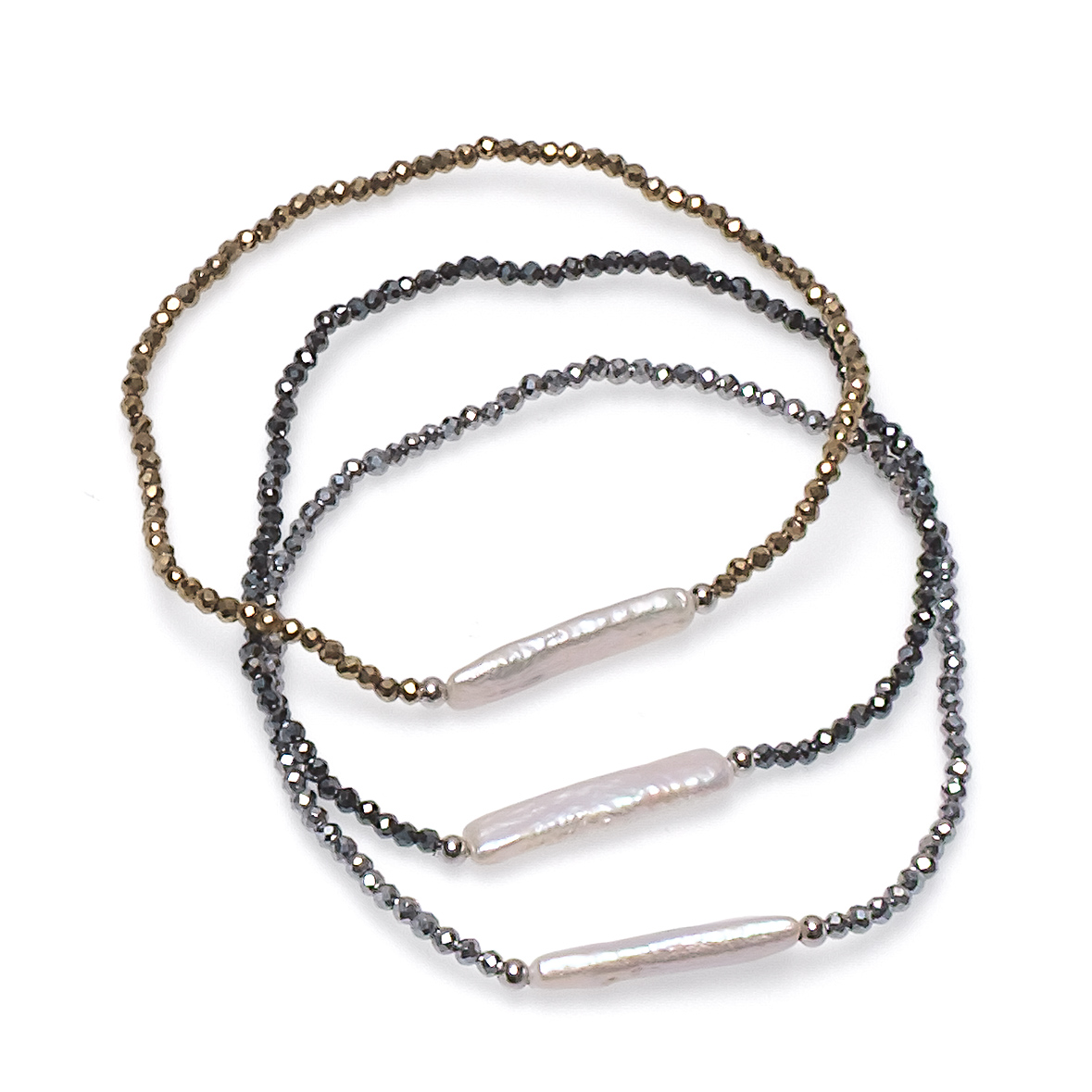 Гривна с една пръчковидна бяла перла, съчетана със сребрист хематит за модерен и изчистен акцент. Дължина 18 см.