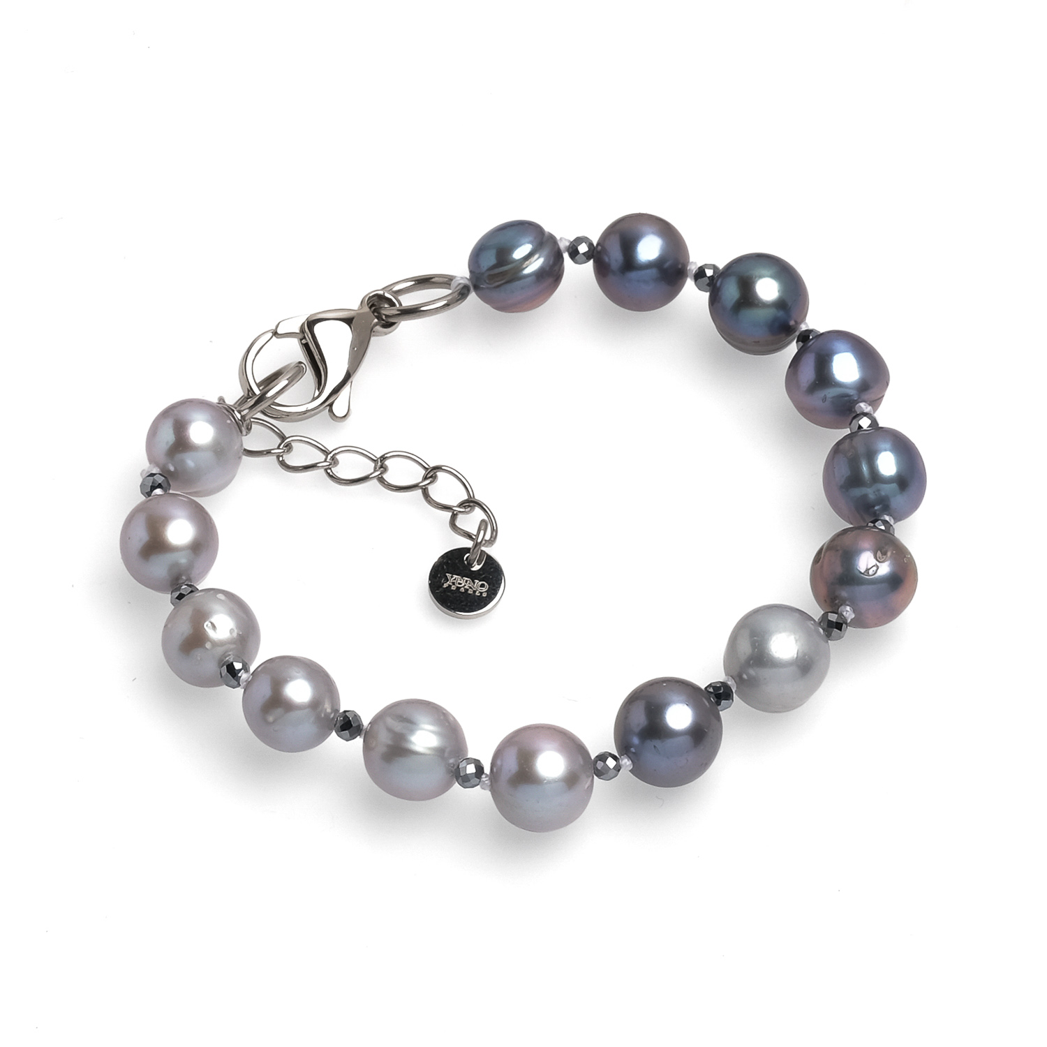 Гривна с тъмни и сиви перли 7-8мм и фасетирани топчета. Стоманена закопчалка с удължител. Дължина на гривната 18 + 4 см.