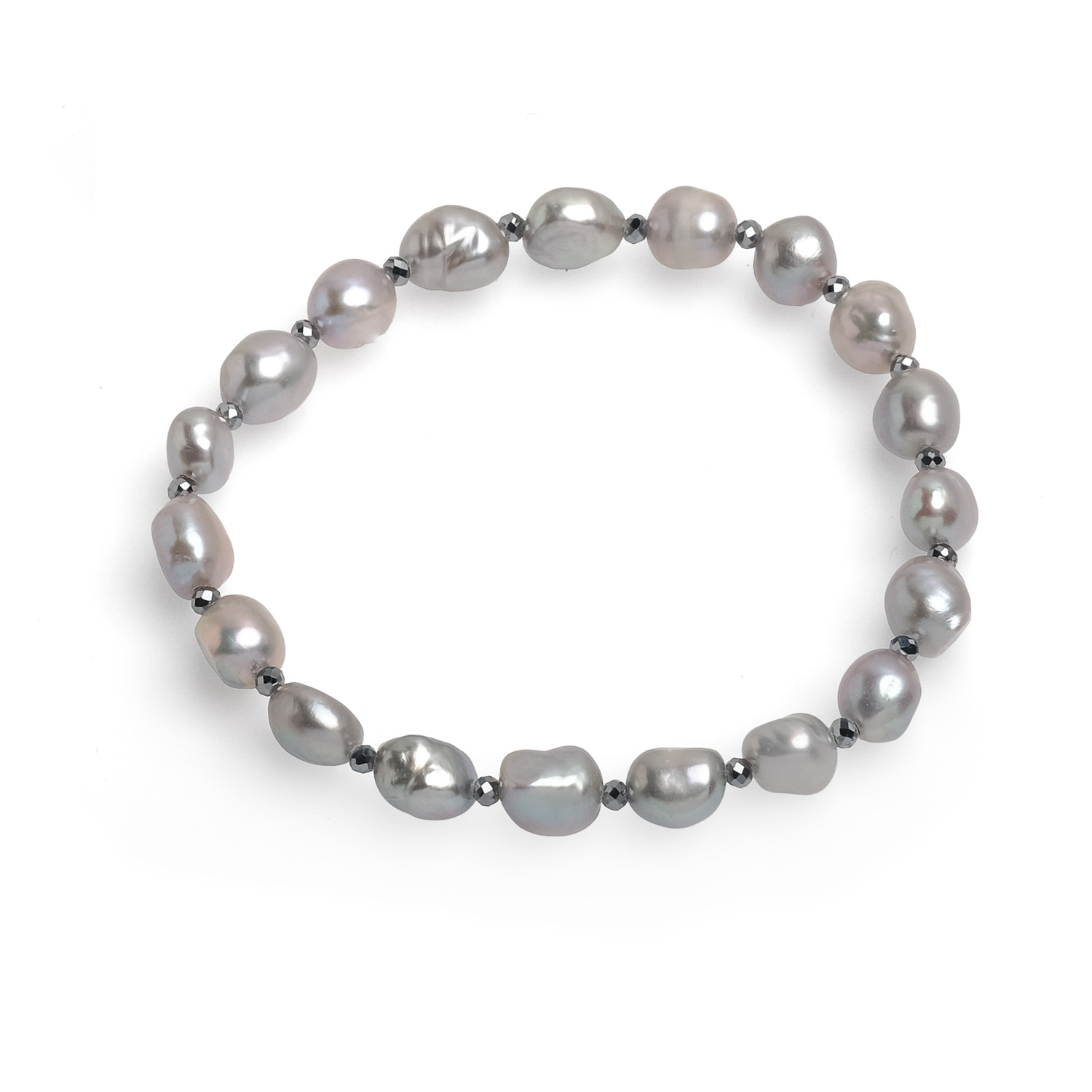 Гривна с асиметрични сиви перли 6-7мм и хематит. Гривната е на ластик и дължина 18 см.