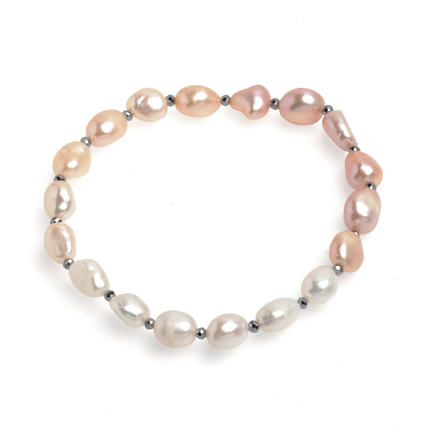 Гривна с асиметрични микс (бели, розови и лилави) перли 6-7мм и хематит. Гривната е на ластик и дължина 18 см.