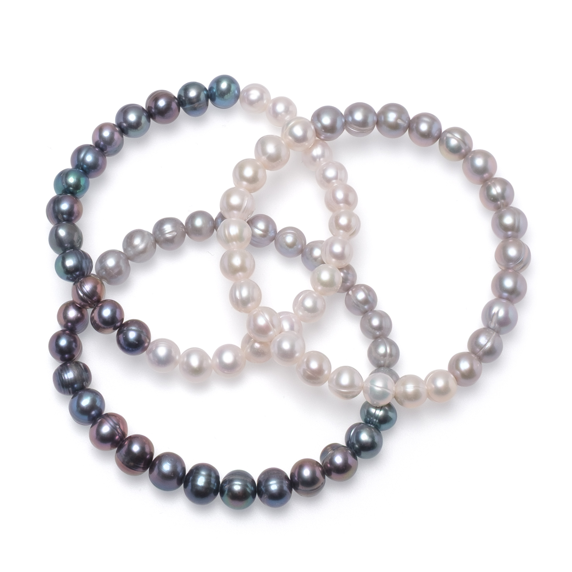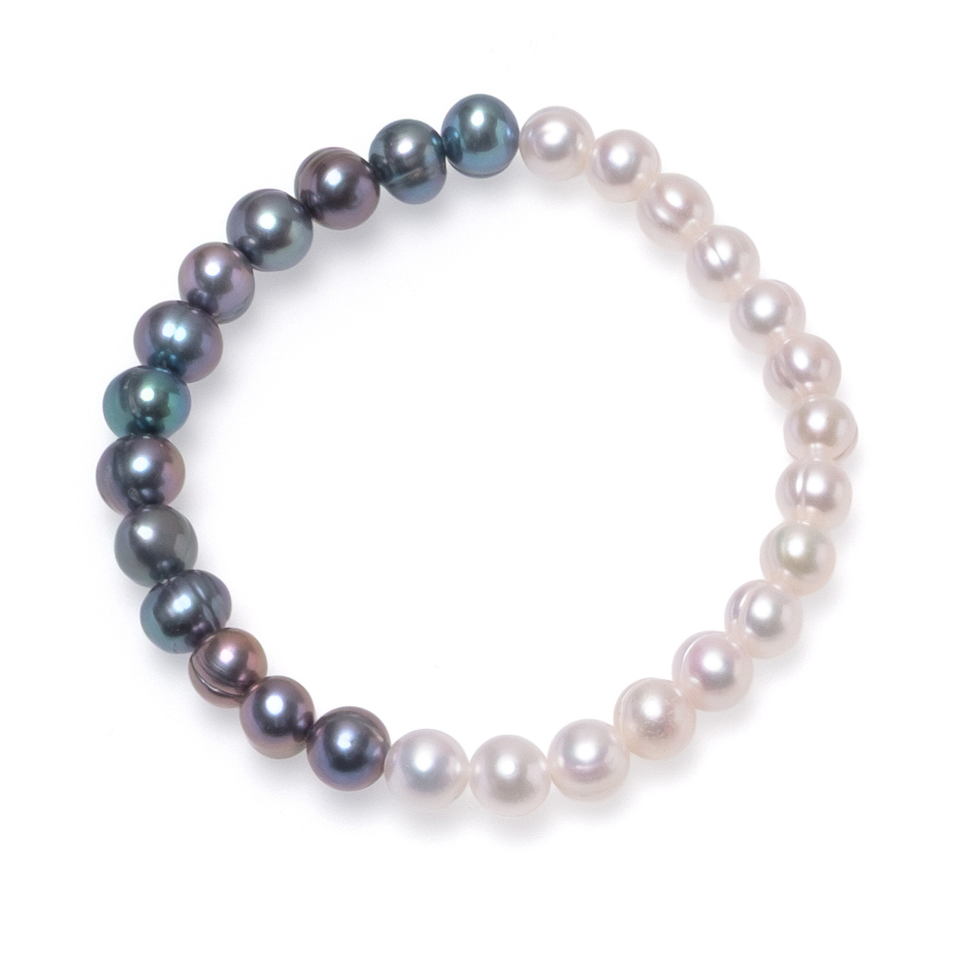 Изящна гривна от естествени перли 7-8мм в елегантен контраст. Половината в класическо бяло, а другата в дълбоки тъмни тонове. Дължина е 19 см, но перлите са нанизани върху еластична основа, която осигурява удобно носене.