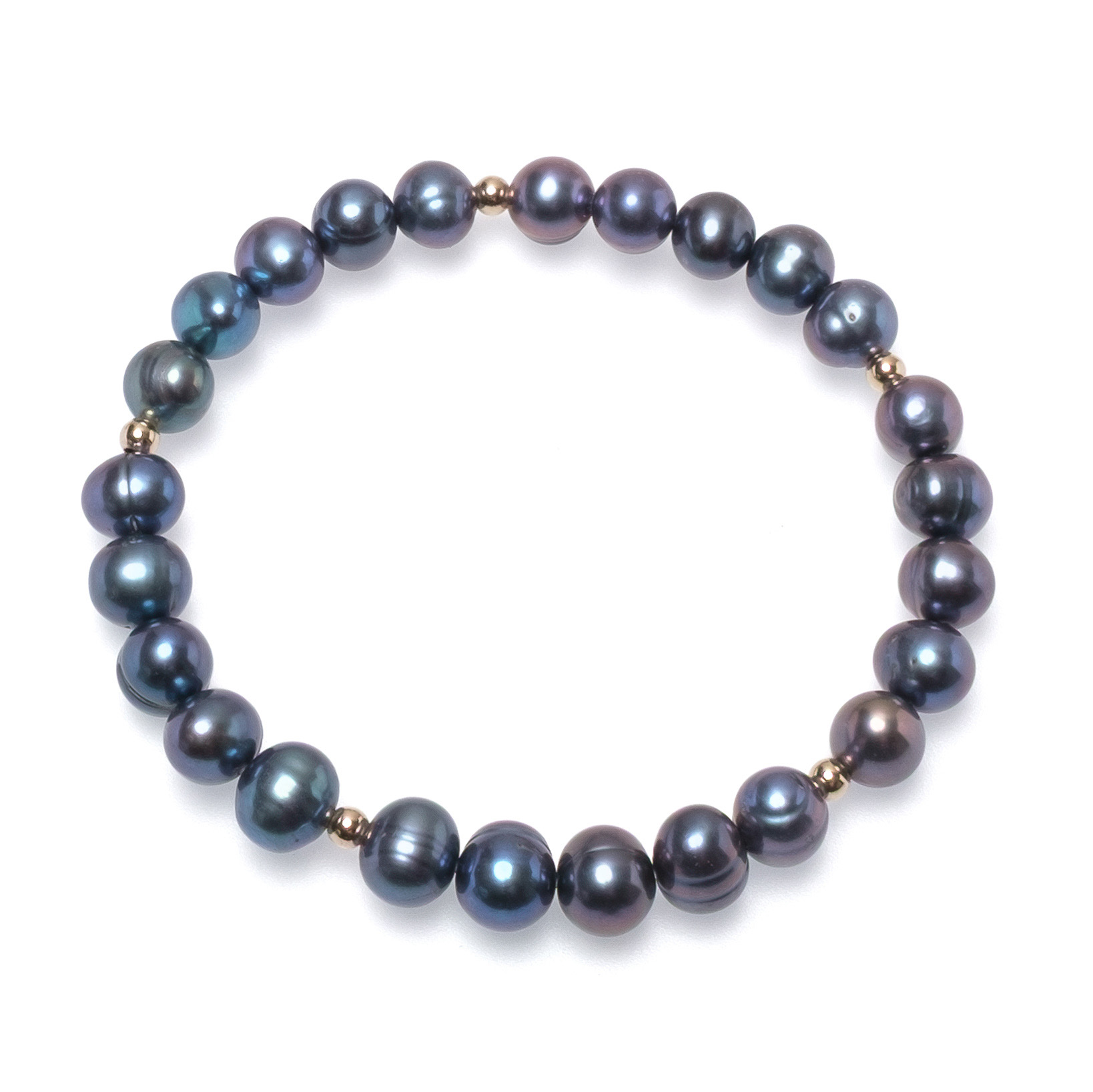 Тази елегантна гривна съчетава 6-7 мм тъмни перли с пет изискани позлатени елемента, които придават блясък и стил.