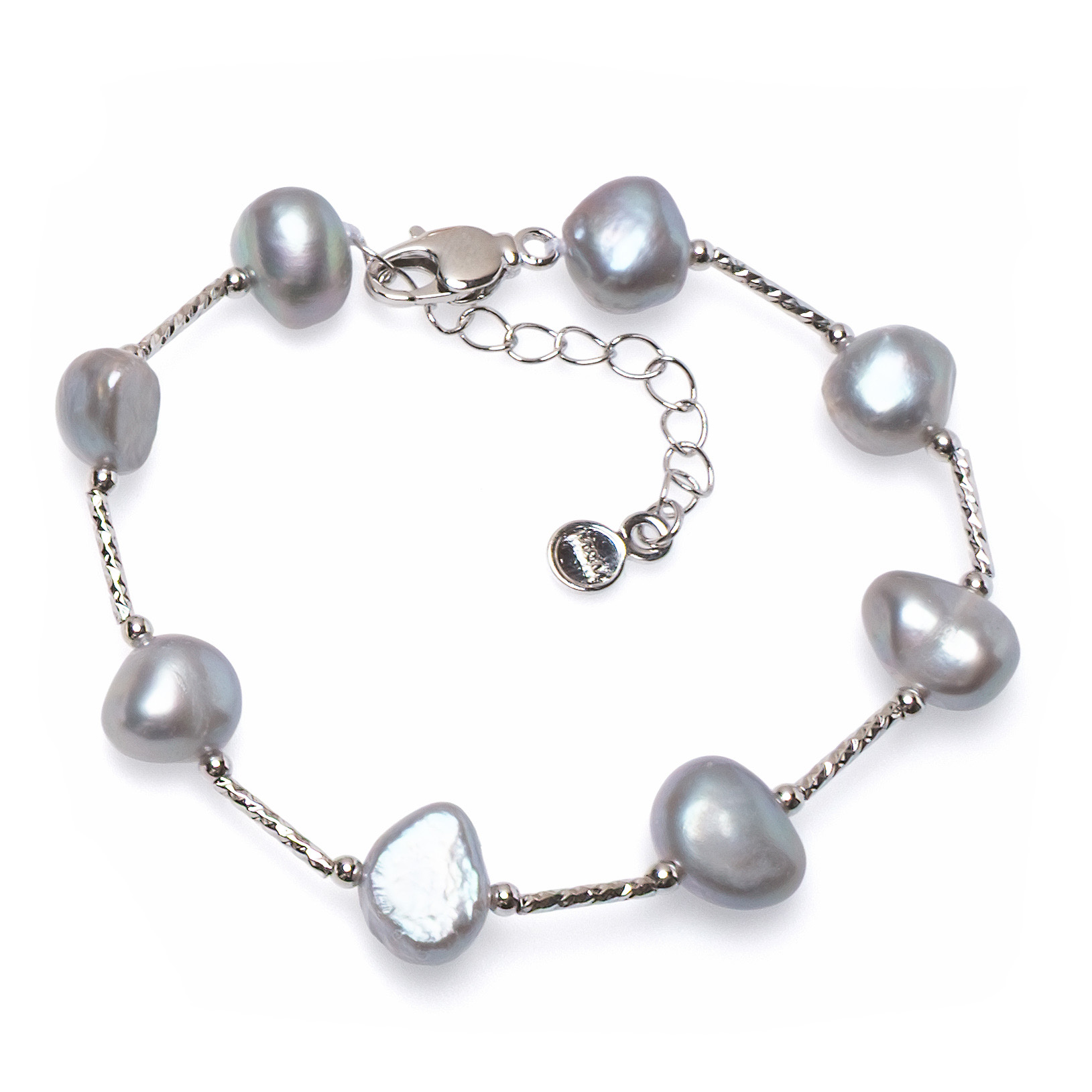 Гривна със сиви асиметрични перли 8-11мм, пръчици. Дължина 18+3 см.