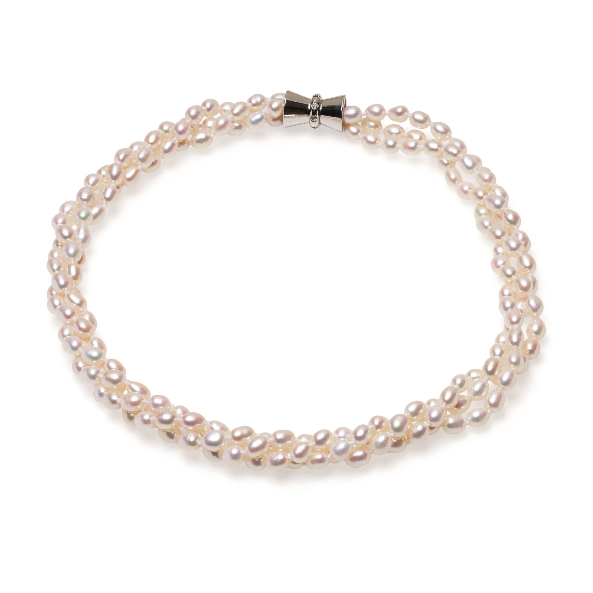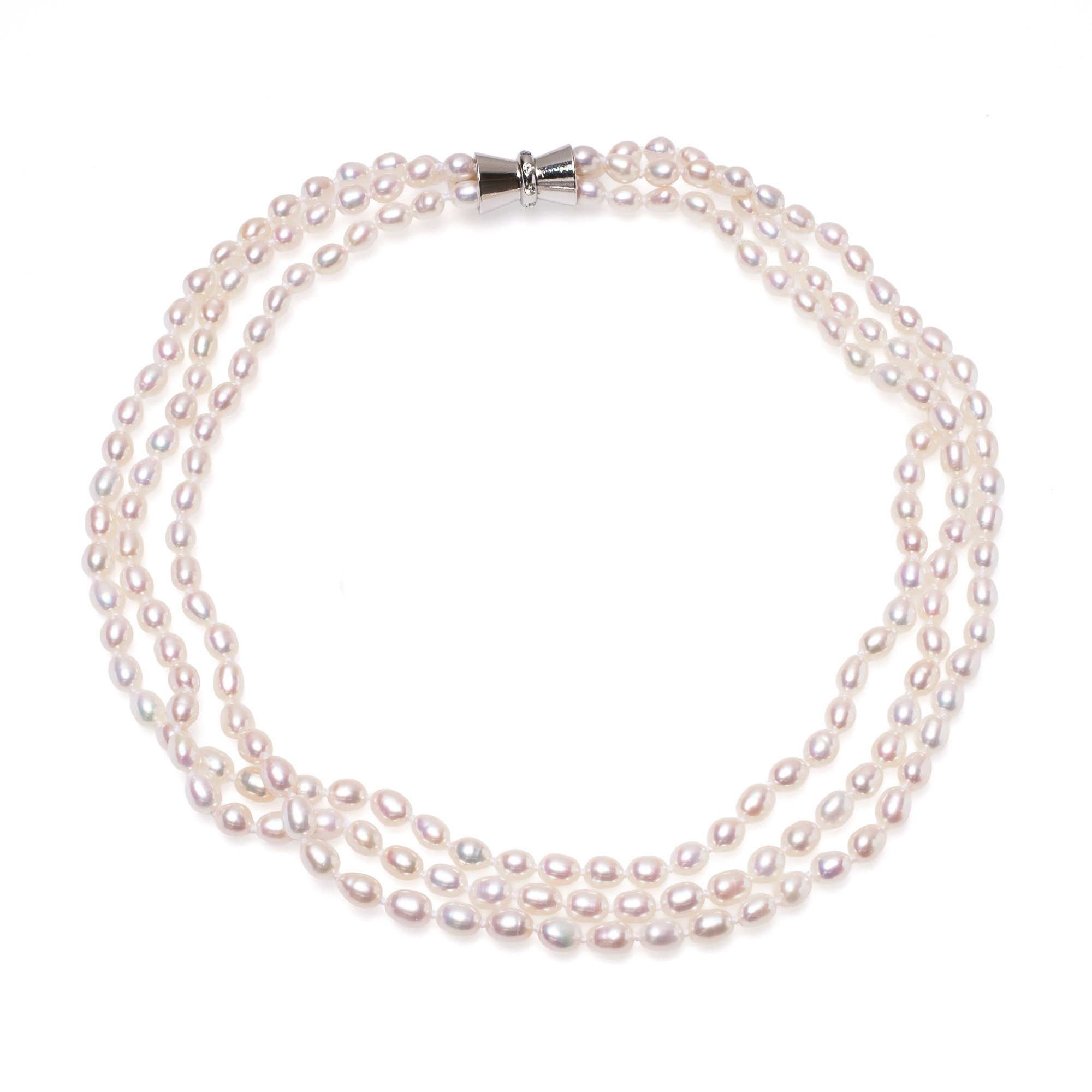 Колие 3реда, 5-6мм бели перли, магнитна закопчалка.,44см