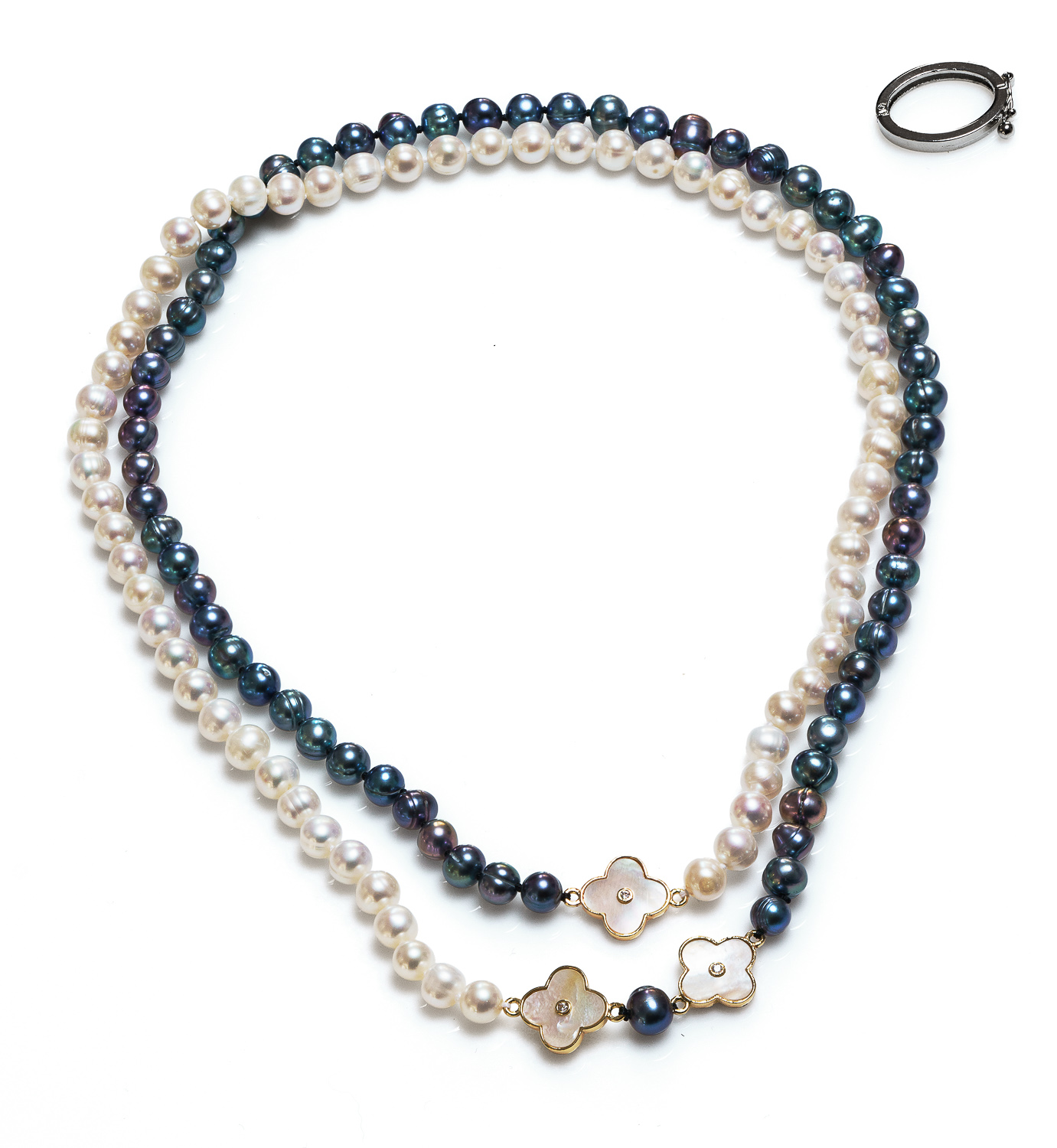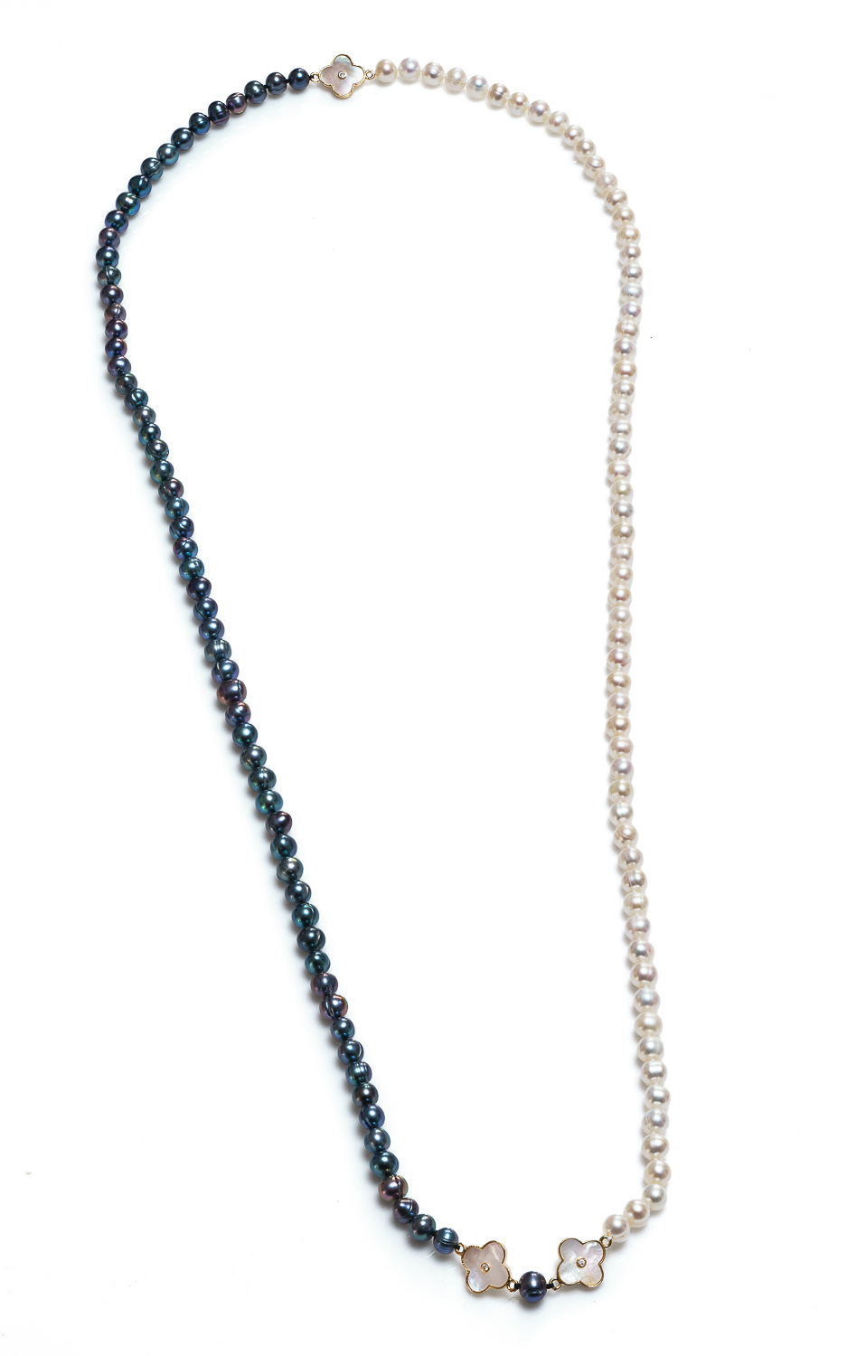 Колие 7-8 мм бели и тъмни пeрли и 3 елемента цветя, 98см