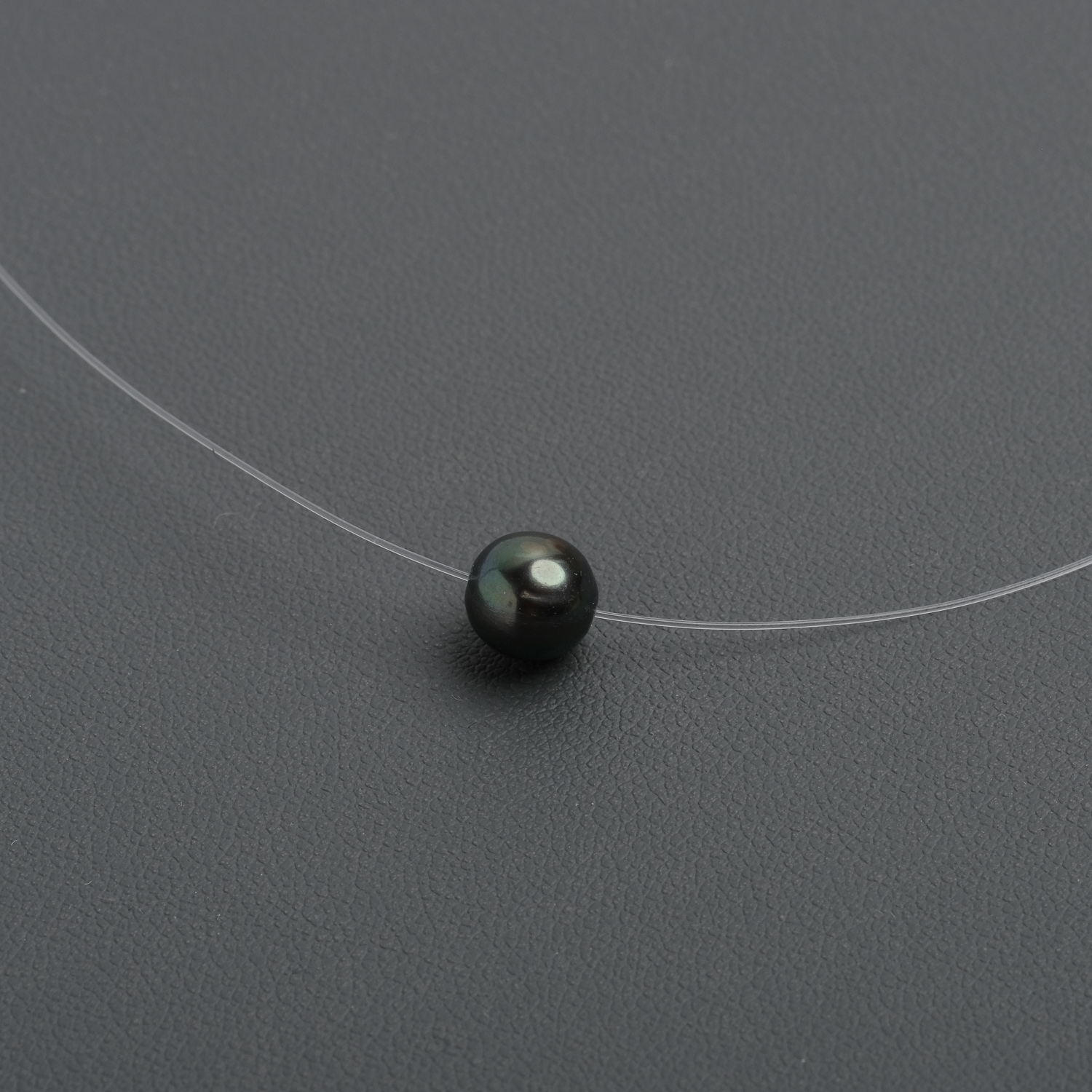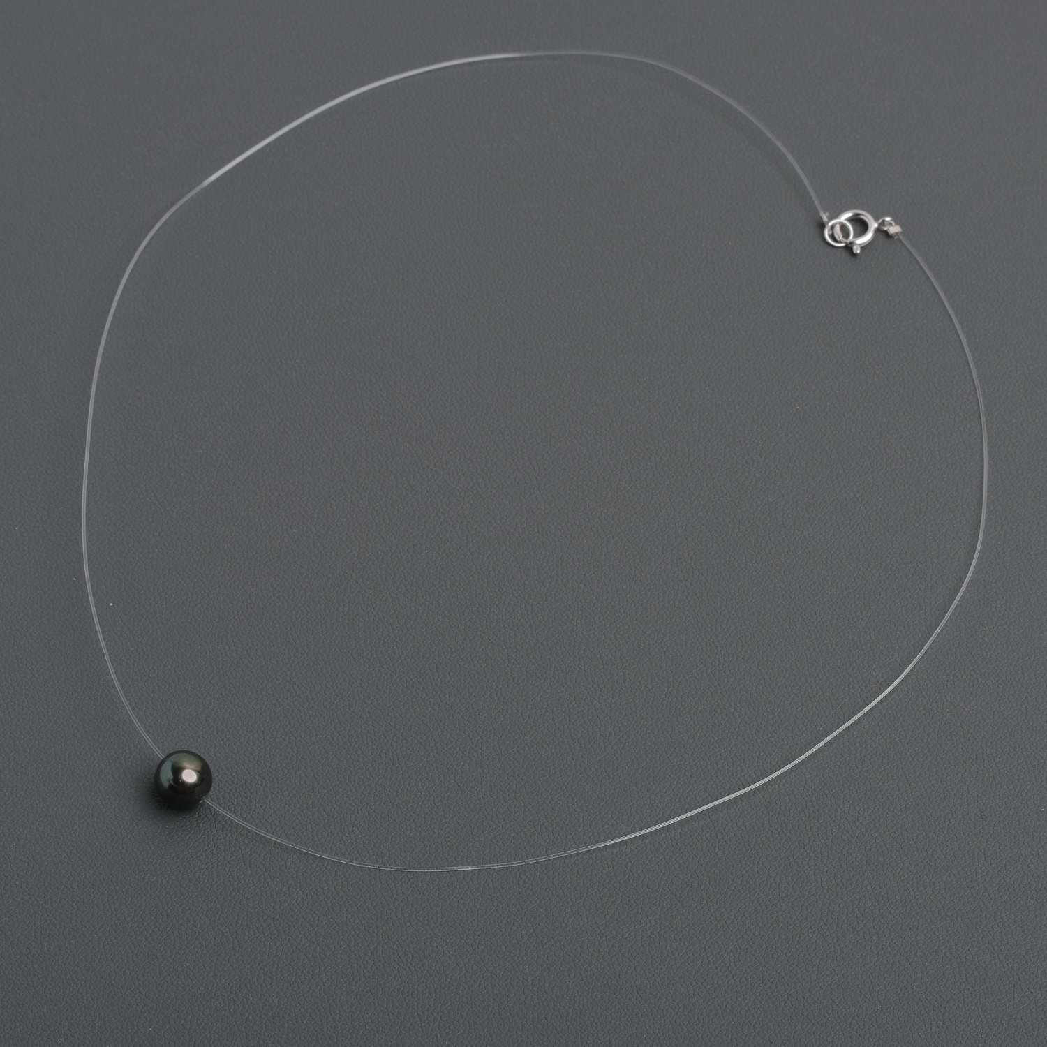 Нежно колие с една тъмна перла 8-9мм на корда и сребърна закопчалка,. Дължина 40см.