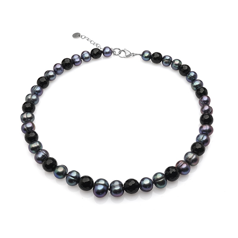 Колие с тъмни перли 9мм и оникс 10мм, 43см+5см