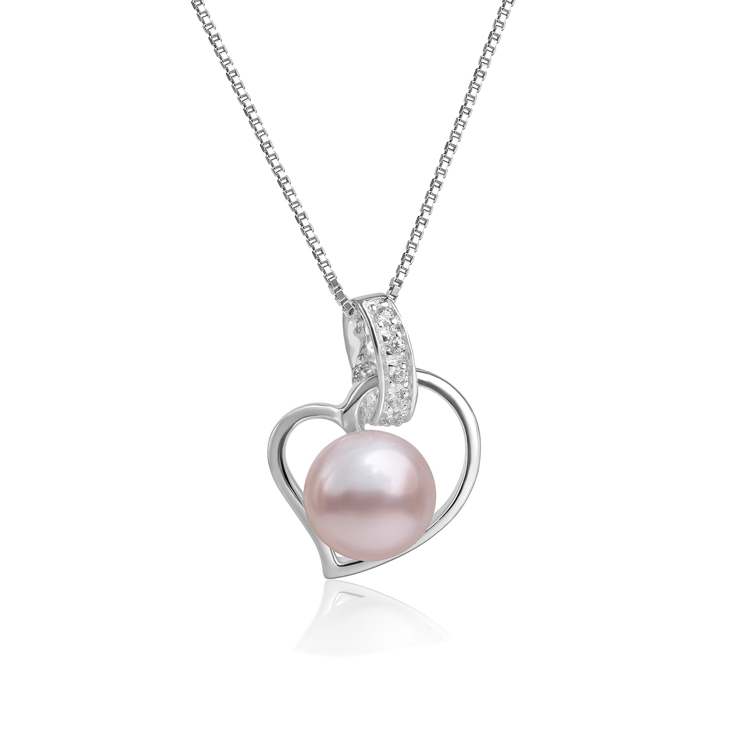 Сребърна висулка с 8-8.5мм лилава перла, сърце, цирконии, родиево покритие.